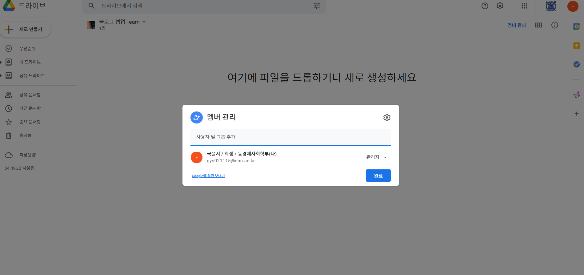 그리고 같이 협업하는 사람의 Gmail을 입력하면 초대받은 사람도 내가 만든 공유 드라이브 디렉토리에 접근할 수 있습니다.