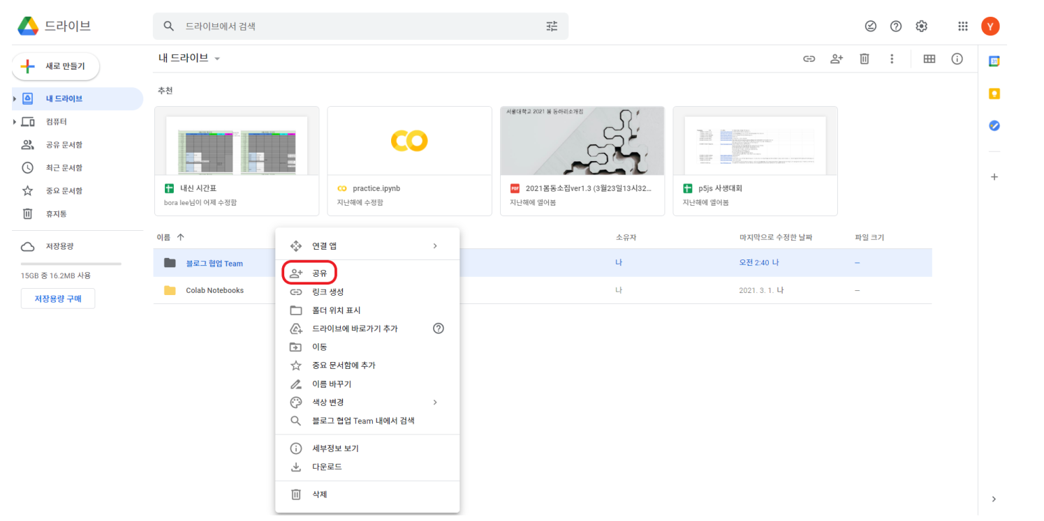 이러한 문제를 해결해주는 것이 구글 드라이브의 '공유' 기능입니다.