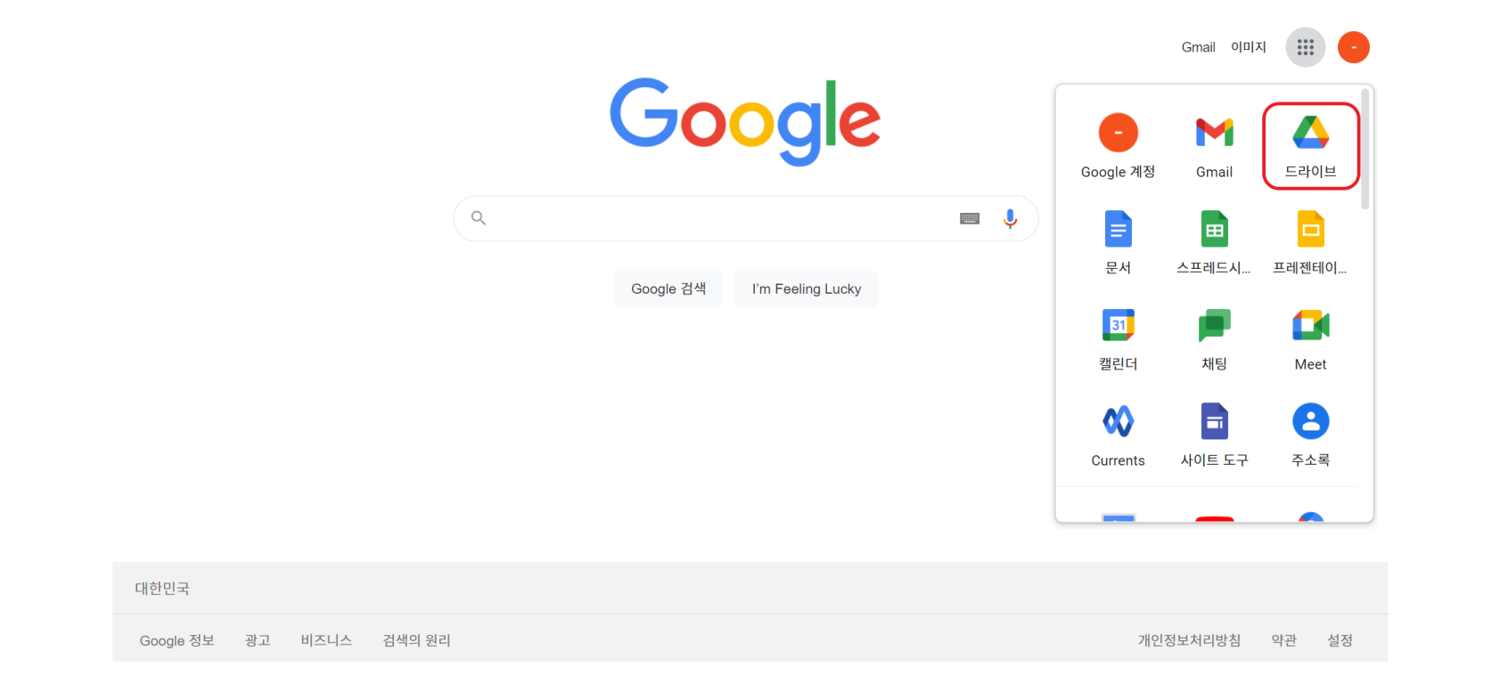 구글 드라이브에 접속하는 방법은 구글 첫 화면에 우측 상단의 햄버거 모양의 네모 상자를 클릭합니다.