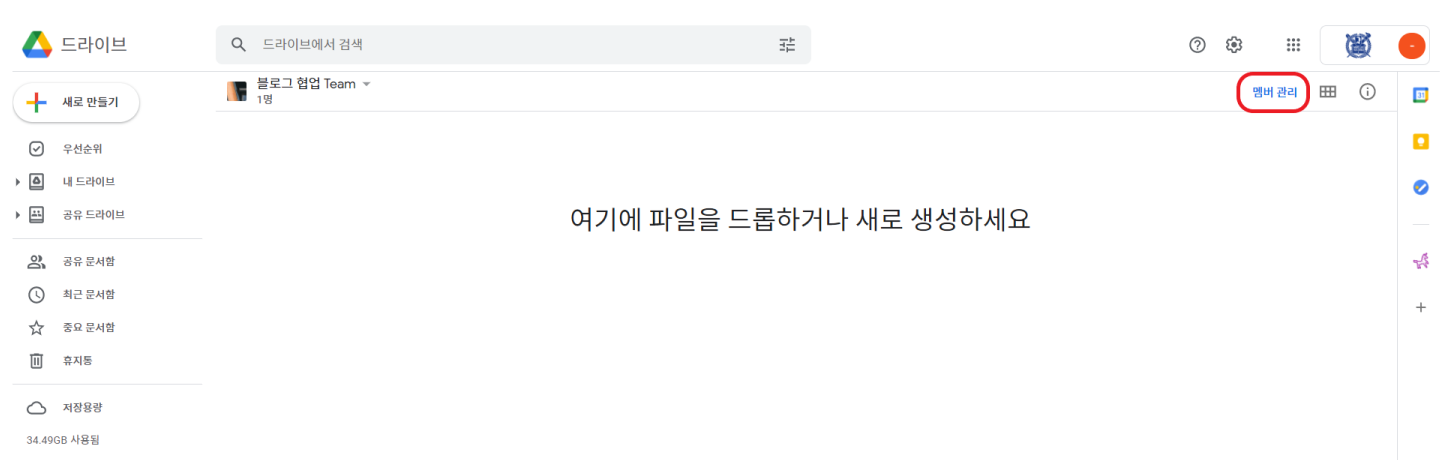 그러면 이렇게 내가 만든 공유 드라이브 항목(블로그 협업 Team)의 최상위 디렉토리로 진입합니다.