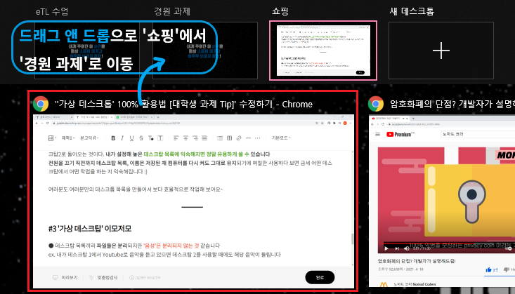 가상 데스크톱 2에서 과제를 하고 있다가 동생이 쿠팡에서 구매해달라는 것이 있으면 데스크톱 3으로 가서 깔끔히 해결하고 다시 데스크톱2로 돌아오는 것이다. 내가 설정해 놓은 데스크탑 목록에 익숙해지면 정말 유용하게 쓸 수 있습니다