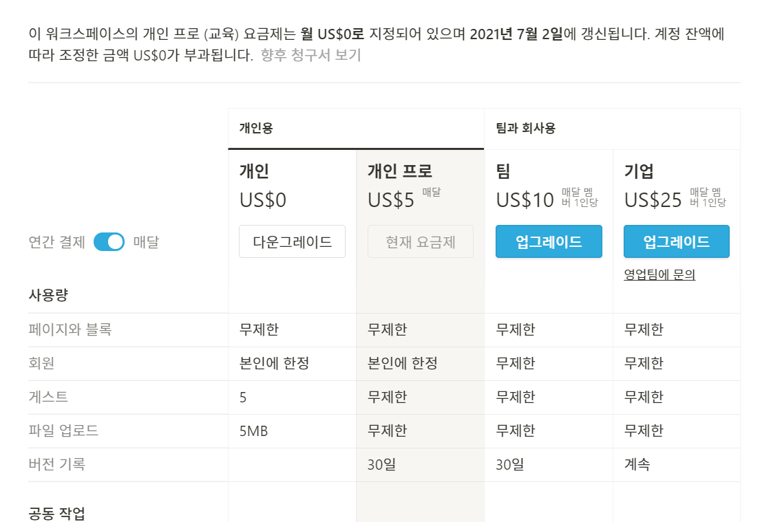 처음 Notion 계정을 만들 때 학교 아이디를 사용해 인증절차를 거치면 '개인 프로' 요금제를 사용하실 수 있고요 또 본인이 다른 계정으로 Notion을 사용해왔다면 학교 메일 주소로 업그레이드를 하실 수도 있습니다.