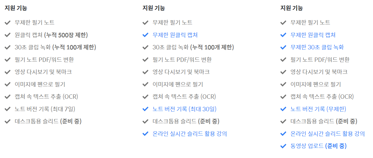 왼쪽부터 오른쪽까지 기능 지원에 따라 가격이 상이합니다