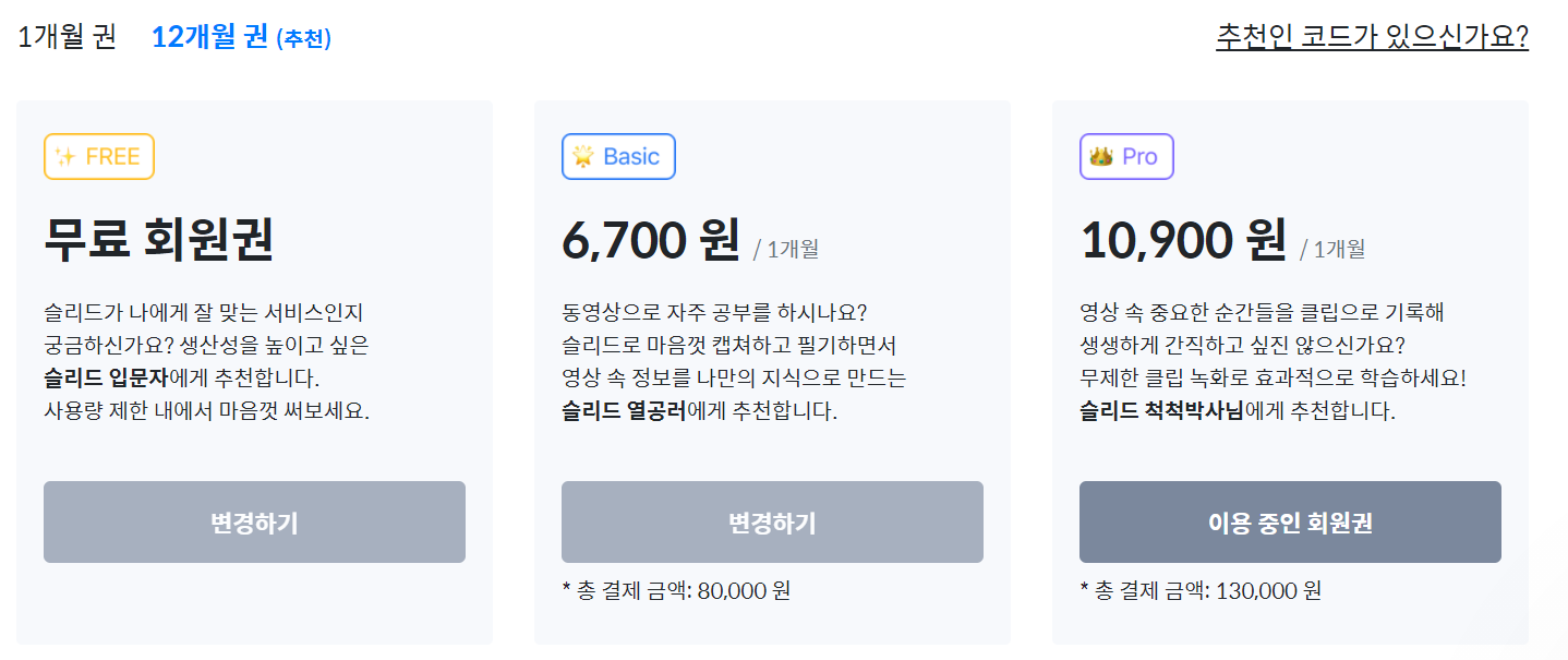 Slid를 제대로 활용하려면 매달 회원권을 결제해야 하는데 그 내역은 다음과 같습니다