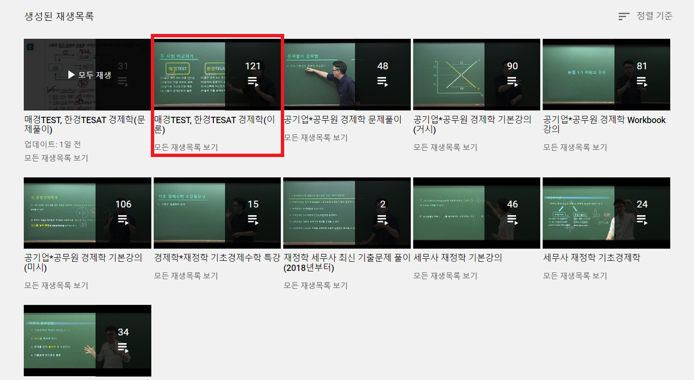 여러 과목들의 영상이 재생목록 별로 나뉘어 있는데요