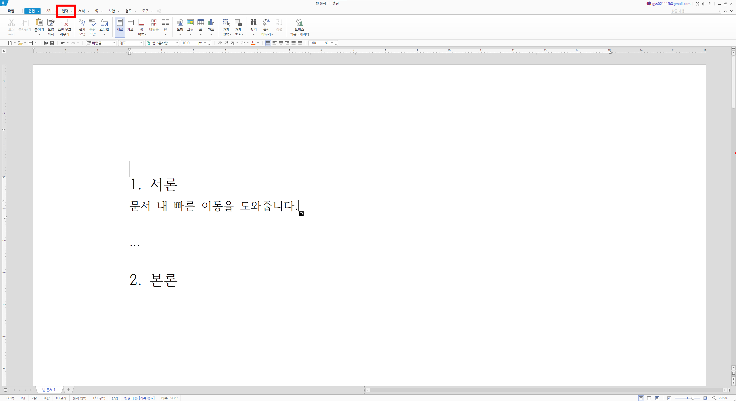 그리고 한글 우측 상단바에서 '입력' 부분을 클릭합니다.
