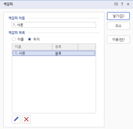 그러면 아래와 같이 '책갈피' 창이 뜨는데요. '책갈피 이름'은 본인이 블록 선택한 영역의 텍스트가 Default 값으로 설정되어 있을 것입니다. 본인이 원하는 이름으로 변경해서 사용하시면 되겠습니다. 그리고 '넣기(D)' 부분을 클릭하면 책갈피 기능 설정을 완료한 것입니다.