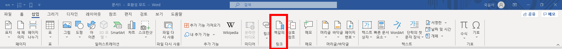 그리고 아래 사진과 같이 '책갈피' 버튼을 클릭합니다.