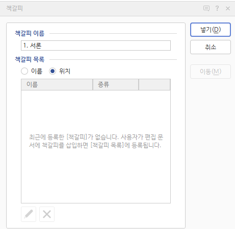한글에서는 북마크 기능을 '책갈피'라고 부릅니다.